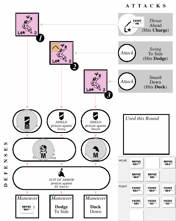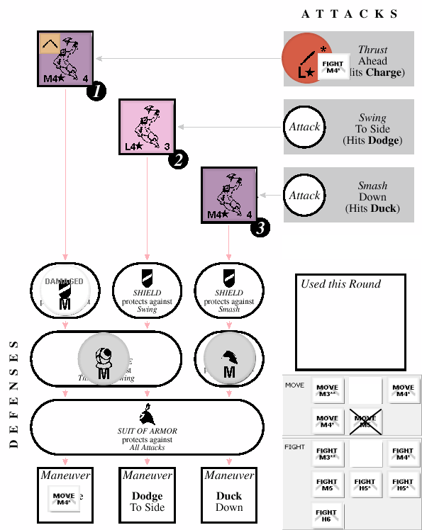 So far, we have determined that we are playing our MOVE M4* chit and our FIGHT H6 chit. The only question we have now is whether we will cover our move or not. This has to do with the second way to hit an enemy in Magic Realm, intercepting his maneuver. So, after you place your chits, and the Tactics step moves (and flips?) the enemies on your sheet, if your attack lines up with your target’s red box (ex. you played Thrust and he is in Thrust and Charge), you intercept and hit him. Also, if your opponent’s red box lines up with your maneuver (ex. he ends up in Duck and Smash and your maneuver is Duck), he intercepts you and hits you.