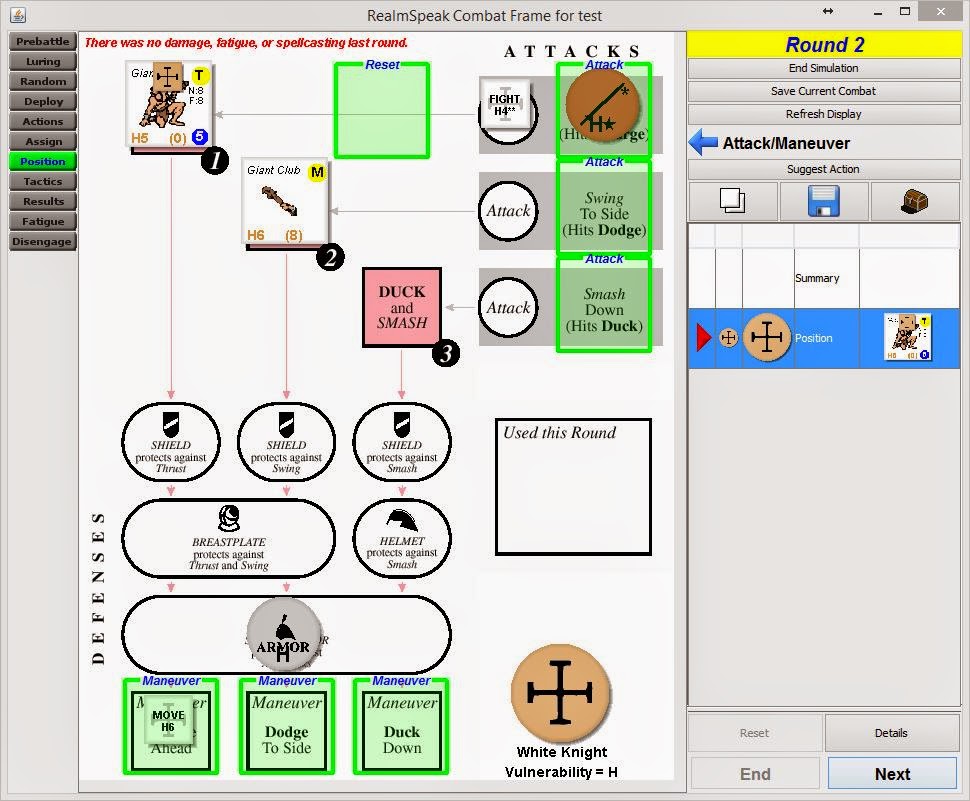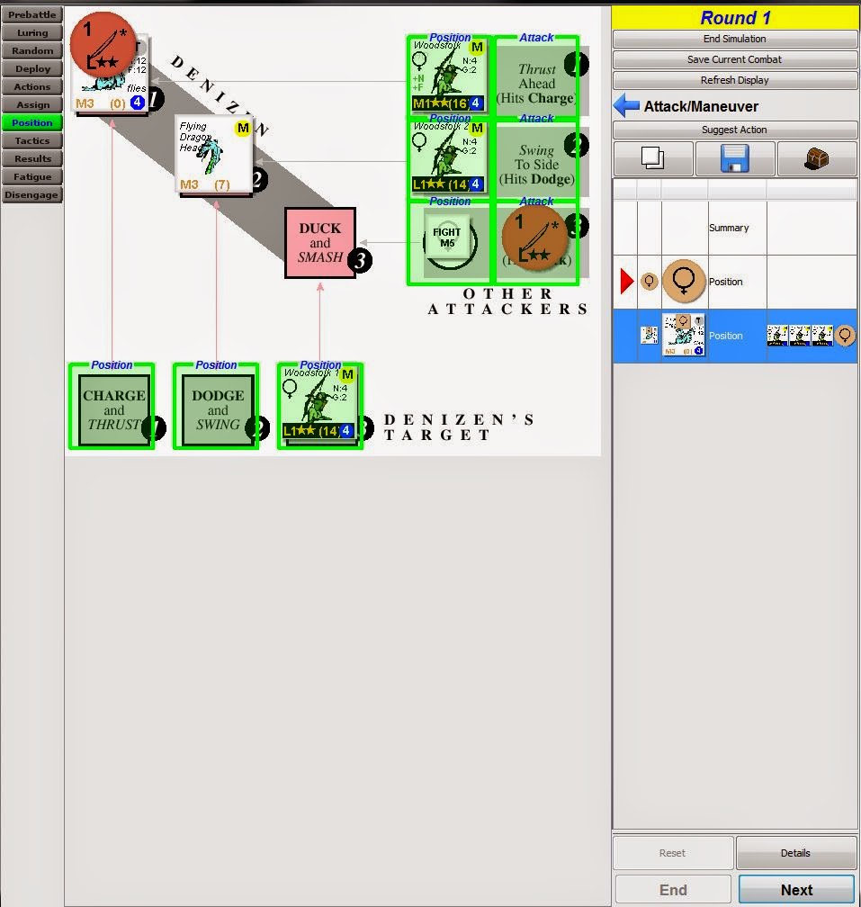 This round is better than the last one because the Black Knight has no enemies on his sheet and so he can alert his mace with any FIGHT chit he has. We pick a FIGHT M5, alert our mace, choose the troll as our target, and move onto the Position step.