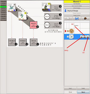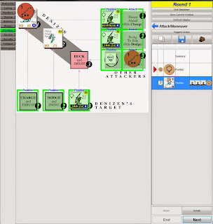 So what happened? Well, first let’s look at the repositioning rolls. Notice that the hirelings on the right-hand side share a single reposition roll, while the target hireling on the bottom gets his own roll. Mainly, this tells you to spread out your hirelings in the attack circles to maximize your chance to hit.
