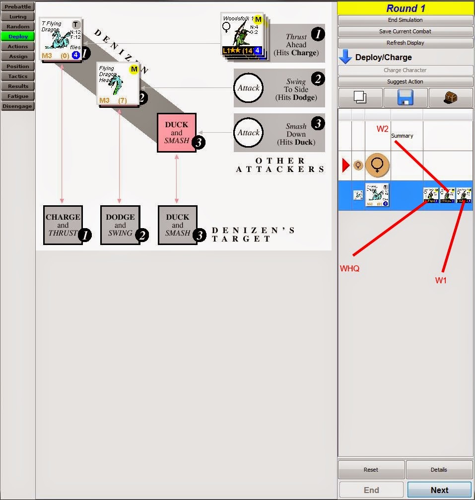 It does not really matter where we position our forces this combat. Each archer will either undercut the Dragon, or not attack at all. Our attacks are all longer and faster than the Dragon’s and so we will get the first shots. We have set this combat up so that all of our attacks get a chance to kill the Dragon. However, if noneof our attacks kill the Dragon, it has a 2/3 chance of smoking poor, brave W1. All in all, we end up with a 43% chance of killing the dragon this round, a 38% chance of losing a hireling, and a 19% chance of no one dying.