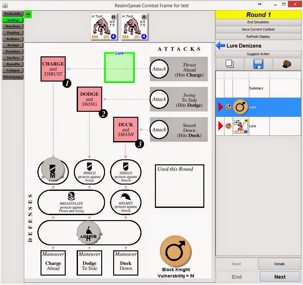 And to keep the concept of hiding (from the previous post in this series) fresh in your head… if the BK and R7 started the combat hidden, can you think of how you would play the battle to kill both trolls and take nofatigue or damage?